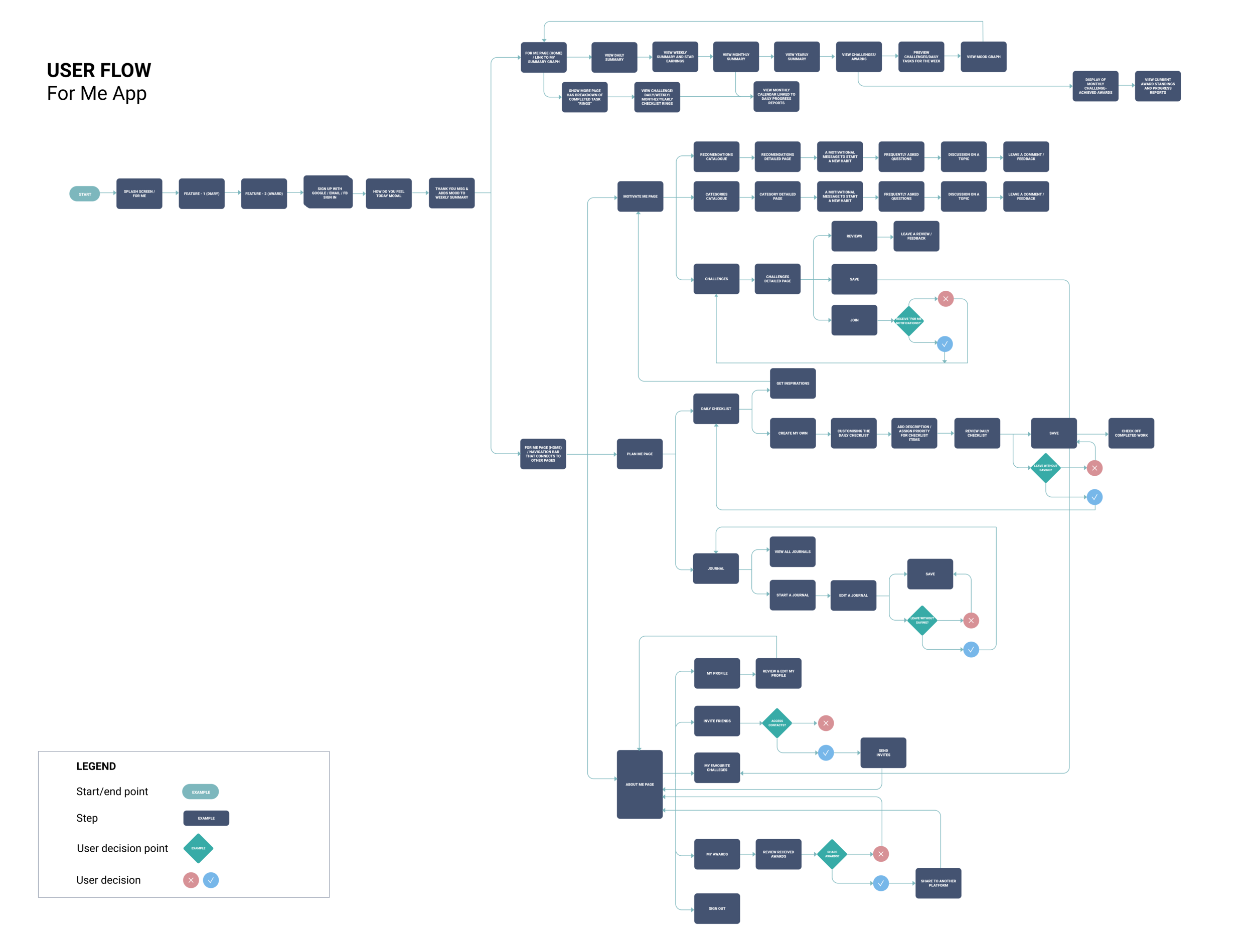 The user flow focused on the navigation of the app itself. More specifically, the app menu bar would divide into 4 categories. The categories were the Motivate Me page (challenges), Plan Me page (checklist and journal), For Me page (homepage), and About Me page (profile settings). These categories each ventured in support of users.